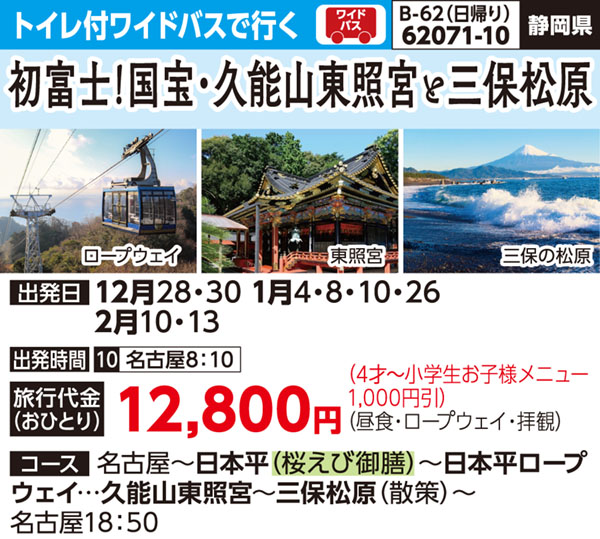 62071-10 | 日帰りバスの旅 | 12,800円 ~ 12,800円 | 2025/12/28 ~ 2026/02/13 |
