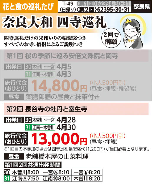 第1回目(安倍文殊院コース)に不参加の場合は四寺巡礼輪袈裟代(1,200円)が当日