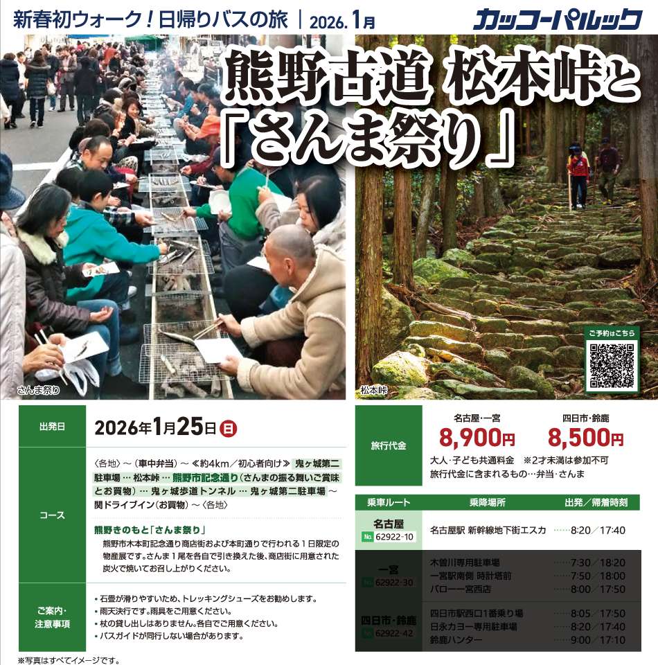 | 62922-10 | 日帰りバスの旅 | 8,900円 ~ 8,900円 | 2026/01/25 ~ 2026/01/25 |