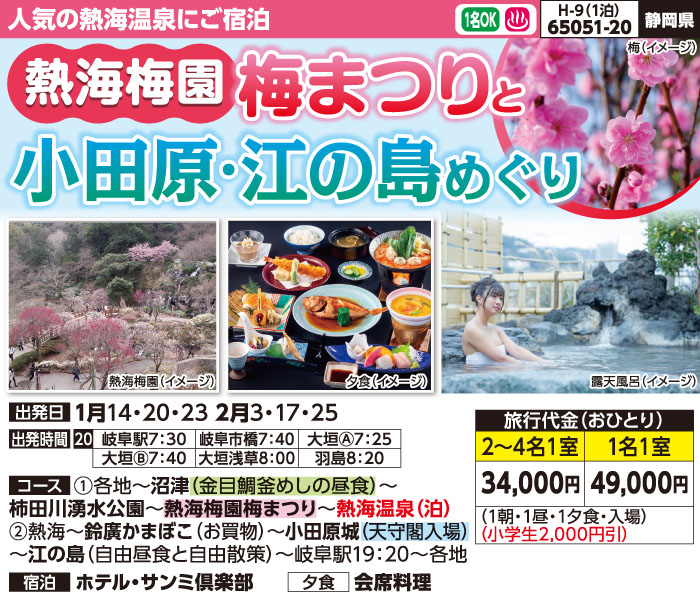 | 65051-20 | 宿泊バスの旅 | 34,000円 ~ 49,000円 | 2026/01/14 ~ 2026/02/25 |