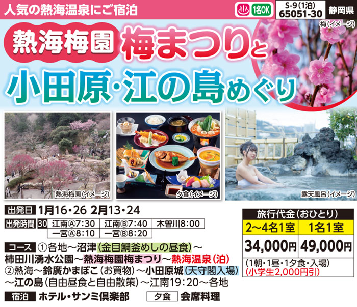| 65051-30 | 宿泊バスの旅 | 34,000円 ~ 49,000円 | 2026/01/16 ~ 2026/02/24 |
