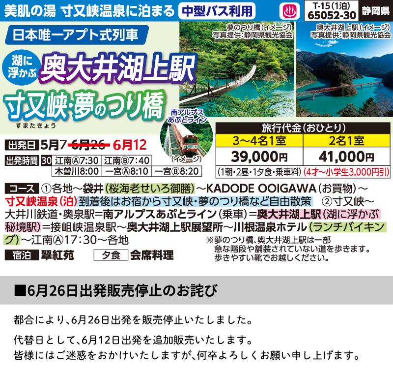 | 65052-30 | 宿泊バスの旅 | 39,000円 ~ 41,000円 | 2026/05/07 ~ 2026/06/26 |