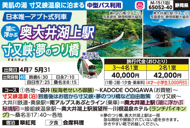 | 65052-40 | 宿泊バスの旅 | 40,000円 ~ 42,000円 | 2026/04/07 ~ 2026/05/31 |