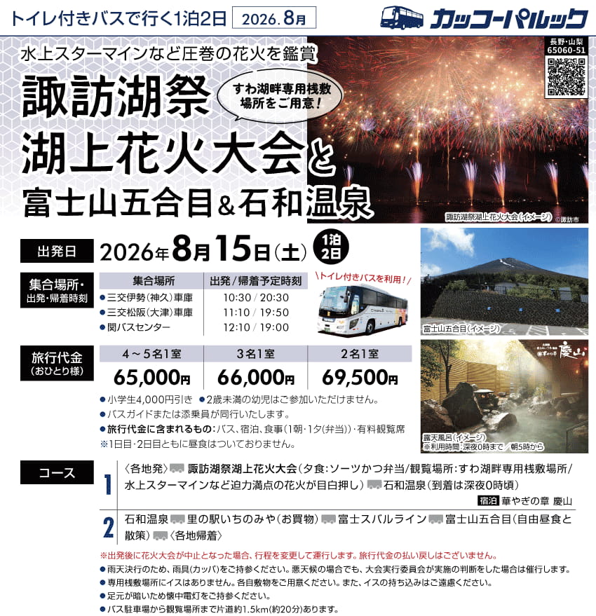 | 65060-51 | 宿泊バスの旅 | 65,000円 ~ 69,500円 | 2026/08/15 ~ 2026/08/15 |