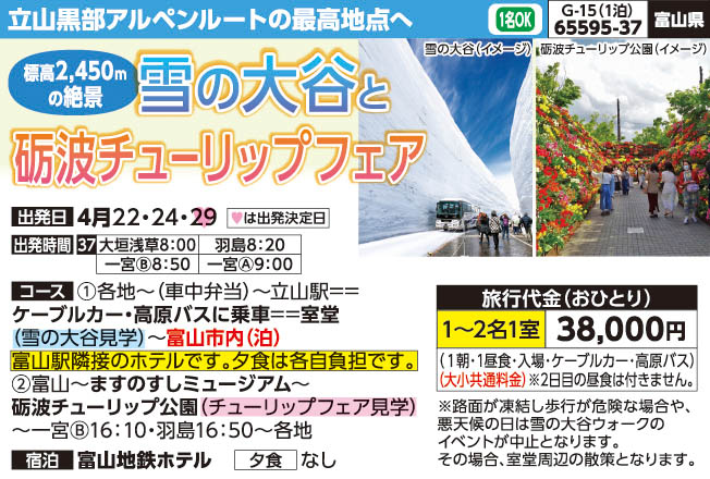| 65595-37 | 宿泊バスの旅 | 38,000円 ~ 38,000円 | 2026/04/29 ~ 2026/04/29 |