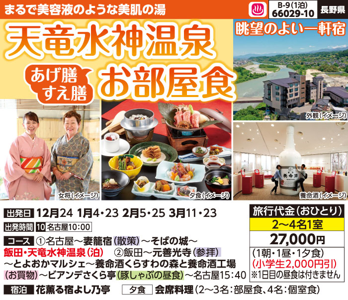 | 66029-10 | 宿泊バスの旅 | 27,000円 ~ 27,000円 | 2025/12/24 ~ 2026/03/23 |