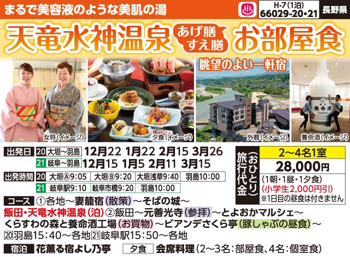 ――――飯田・天竜水神温泉(16:00頃着/泊)