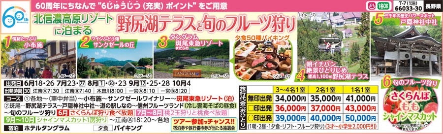 | 66033-30 | 宿泊バスの旅 | 34,000円 ~ 50,000円 | 2026/06/18 ~ 2026/10/04 |