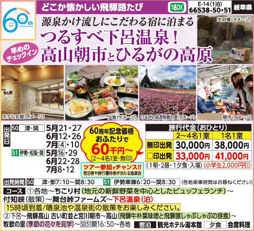 | 66538-51 | 宿泊バスの旅 | 30,000円 ~ 41,000円 | 2026/05/16 ~ 2026/07/12 |