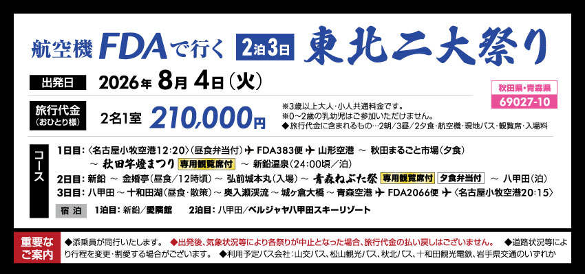 ※気象状況により各祭りが中止となった場合でも、旅行代金の払い戻しはありません。