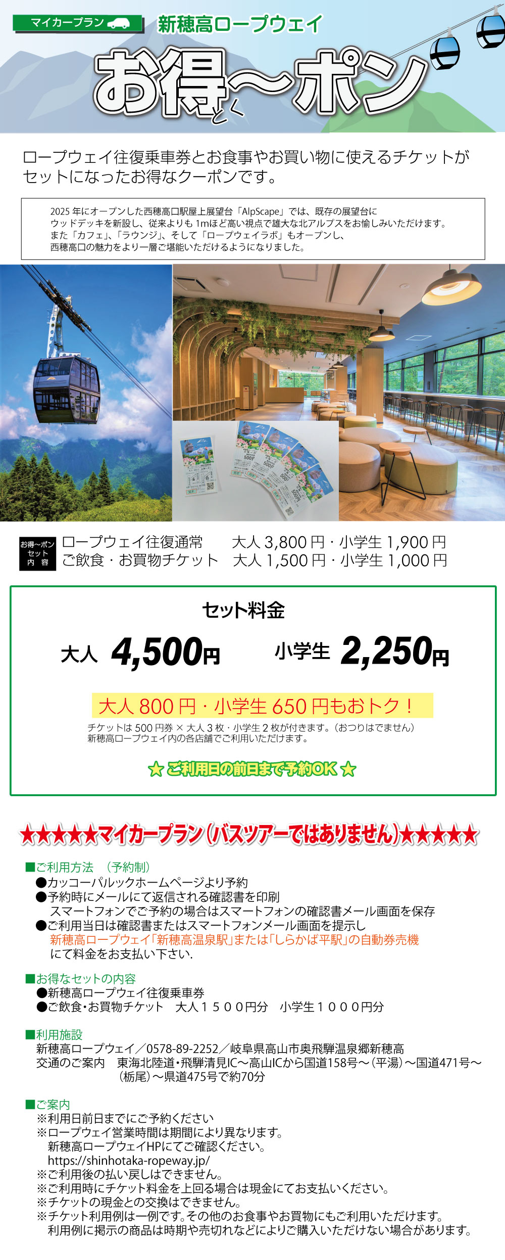 マイカープラン:【新穂高ロープウェイお得~ポン】